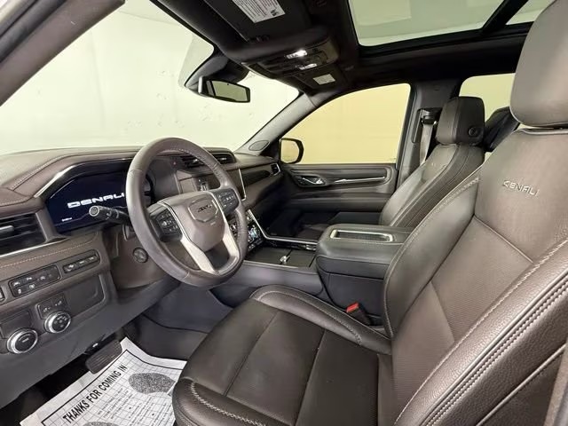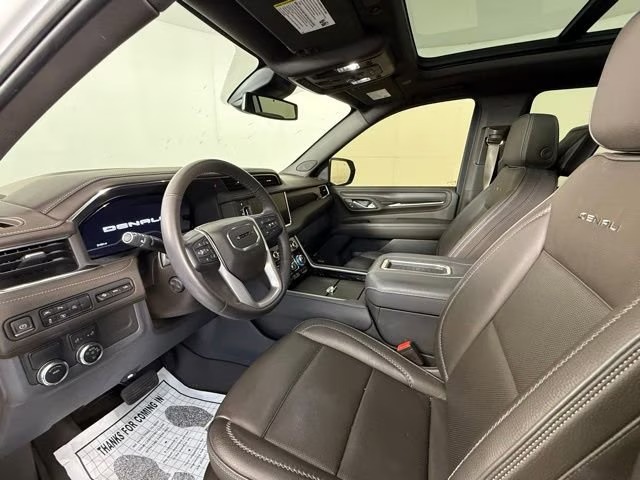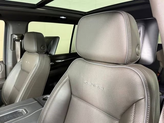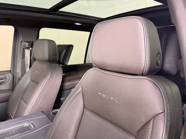 Inside, the Denali trim pulls out all the stops. Seating for seven is standard via second‑row captain’s chairs (or bench for eight), with luxury touches like hand‑stitched leather, wood‑grain trim, heated and ventilated front seats, heated second‑row seats, and a heated leather‑wrapped steering wheel. Technology includes a premium infotainment system with Google‑based interface, large touchscreen display, a digital gauge cluster, heads‑up display, and a Bose sound system that fills the cabin with clear audio.