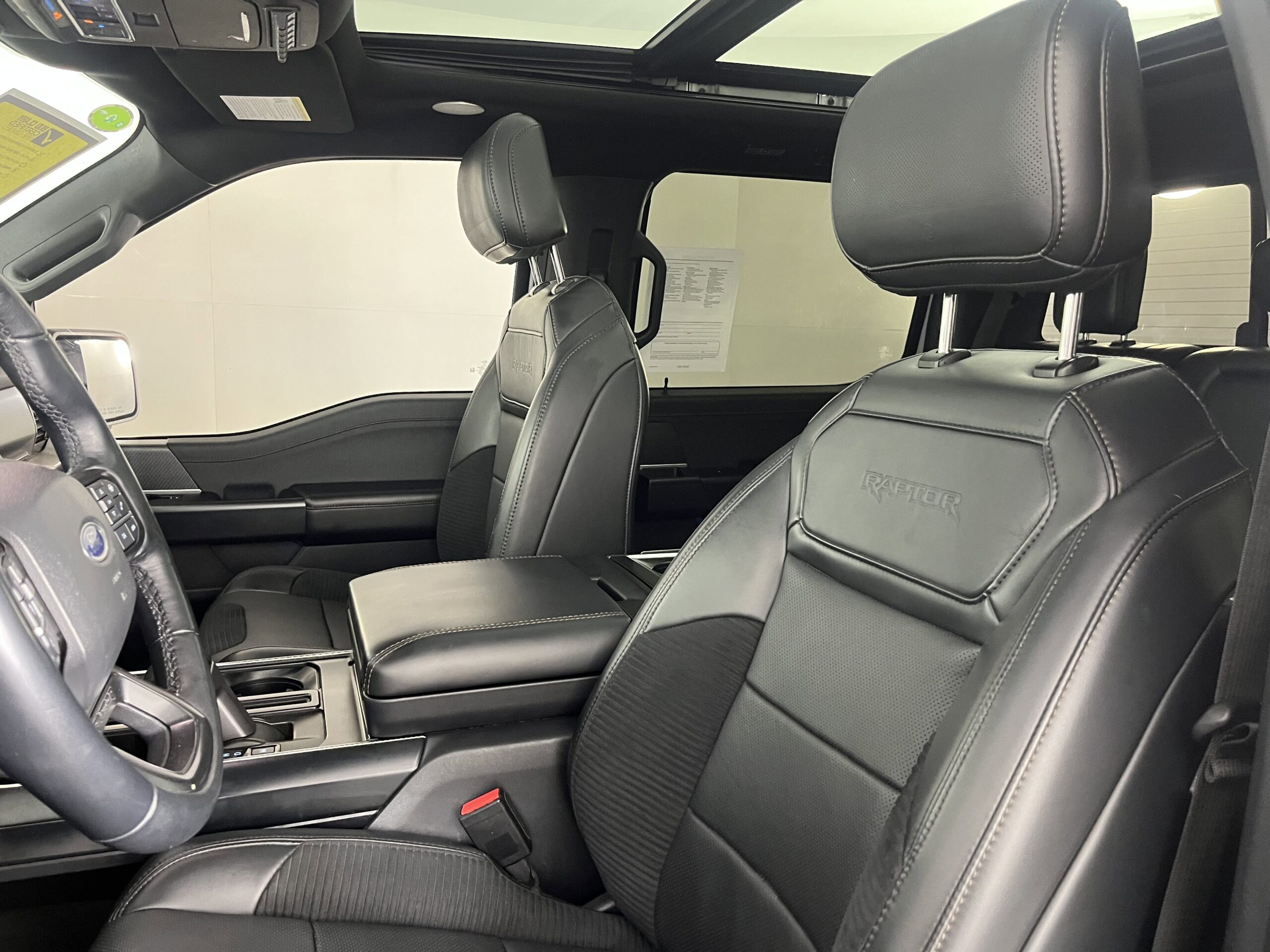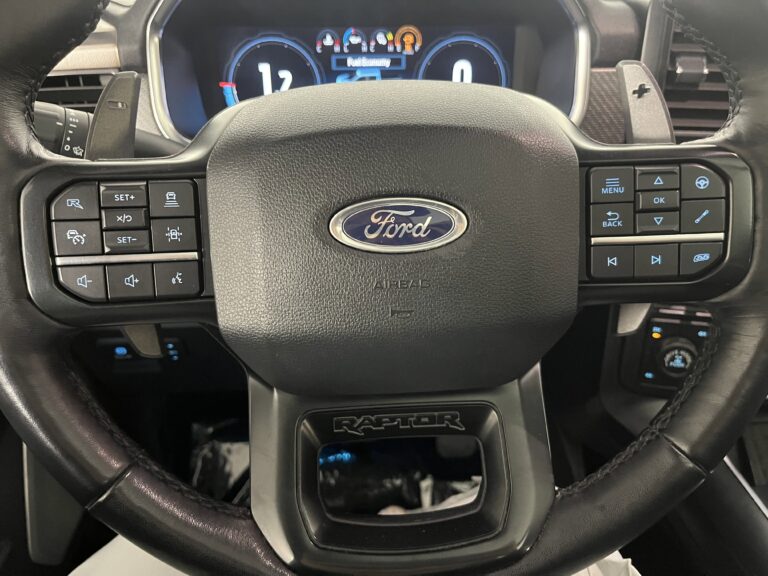 Inside the cabin, the Raptor is as comfortable as it is rugged. The SuperCrew cab seats five and offers plenty of rear legroom. It features premium materials, Recaro sport seats (optional), and advanced tech including a 12-inch digital gauge cluster, 12-inch touchscreen with SYNC 4, wireless Apple CarPlay and Android Auto, and a premium B&O sound system on higher trims.
